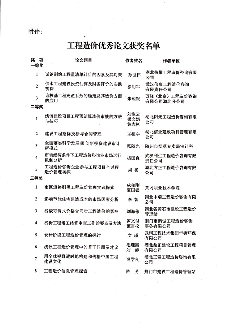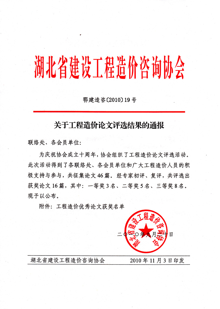 热烈祝贺我公司在湖北省建设工程造价咨询协会十周年之际举办的“工程造价论文评选活动”中获得三等奖。