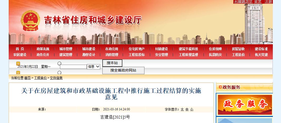 3月16日,吉林省住建厅发布《关于在房屋建筑和市政基础设施工程中推行施工过程结算的实施意见》。施工合同工期一年(含一年)以上的房屋建筑和市政基础设施工程,推行施工过程结算。鼓励施工过程结算实行全过程造价咨询服务: