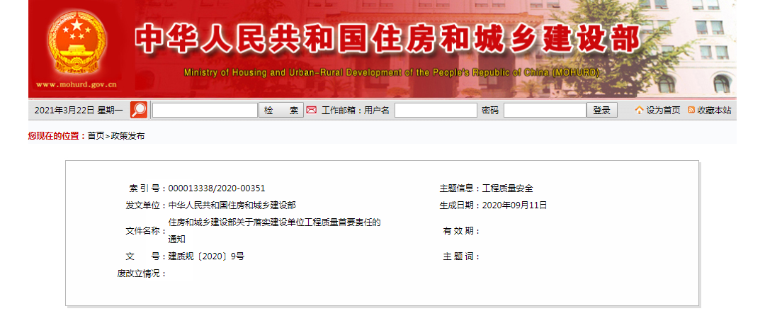 2020年9月23日,住建部官网发布《关于落实建设单位工程质量首要责任的通知》,严格落实建设单位工程质量首要责任。同时提出: