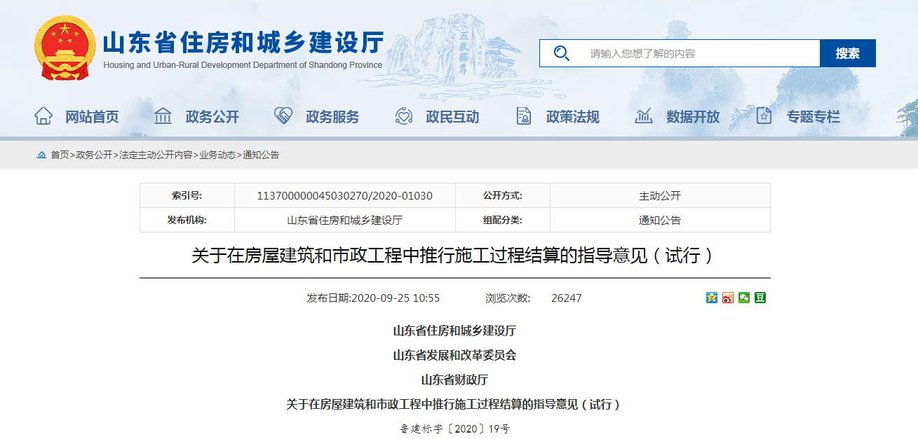 2020年9月17日,山东省住房城乡建设厅、省发展改革委、省财政厅三部门联合印发《关于在房屋建筑和市政工程中推行施工过程结算的指导意见(试行)》,通过规范结算行为,缩短结算周期,减轻企业负担: