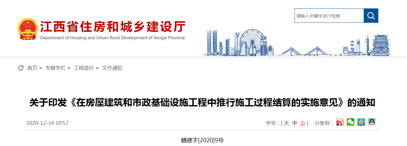 2020年12月14日,江西省住建厅发布通知,印发《在房屋建筑和市政基础设施工程中推行施工过程结算的实施意见》,自下文之日起施行。
