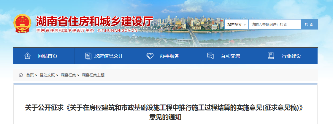 2020年5月28日,湖南省住建厅发布《关于在房屋建筑和市政基础设施工程中推行施工过程结算的实施意见(征求意见稿)》,在省内房建、市政项目中全面推行施工过程结算。