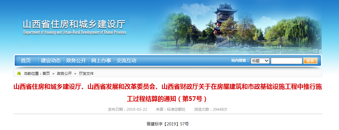 2019年3月22日,《山西省住房和城乡建设厅、山西省发展和改革委员会、山西省财政厅关于在房屋建筑和市政基础设施工程中推行施工过程结算的通知(第57号)》(以下简称《通知》)发布,从5月1日起,在房建和市政工程中推行施工过程结算: