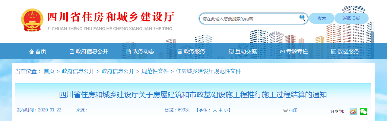 2020年1月22日,四川发文,全省房屋建筑和市政基础设施工程施工合同工期两年以上的新开工项目要积极推行施工过程结算。从2020年3月1日起执行,有效期5年。