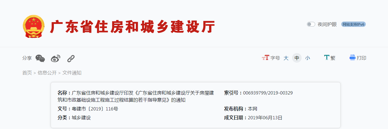 2019年6月13日,广东省住建厅印发通知,推进全省房屋建筑和市政基础设施工程施工过程结算。