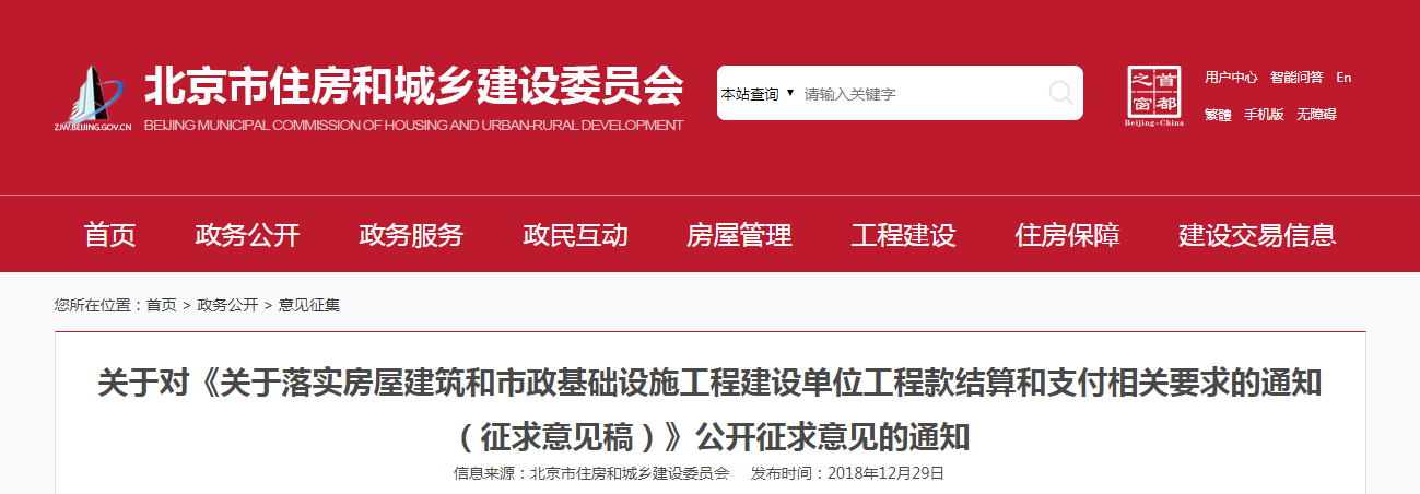 2019年1月17日,北京市住建委发布《落实房屋建筑和市政基础设施工程建设单位工程款结算和支付相关要求的通知》,其中明确指出: