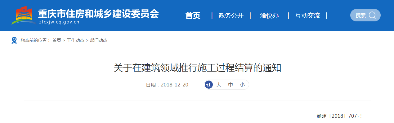 2018年12月20日,重庆市住建委发布《关于在建筑领域推行施工过程结算的通知》,要求:新开工、建设工期两年以上工程,推行施工过程结算。