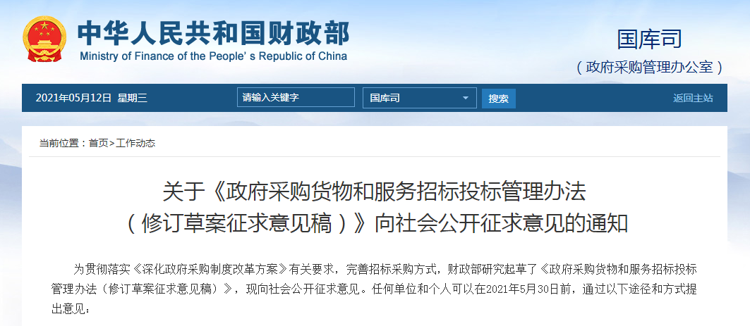 为贯彻落实《深化政府采购制度改革方案》有关要求,完善招标采购方式,财政部研究起草了《政府采购货物和服务招标投标管理办法(修订草案征求意见稿)》,现向社会公开征求意见。任何单位和个人可以在2021年5月30日前,通过以下途径和方式提出意见: