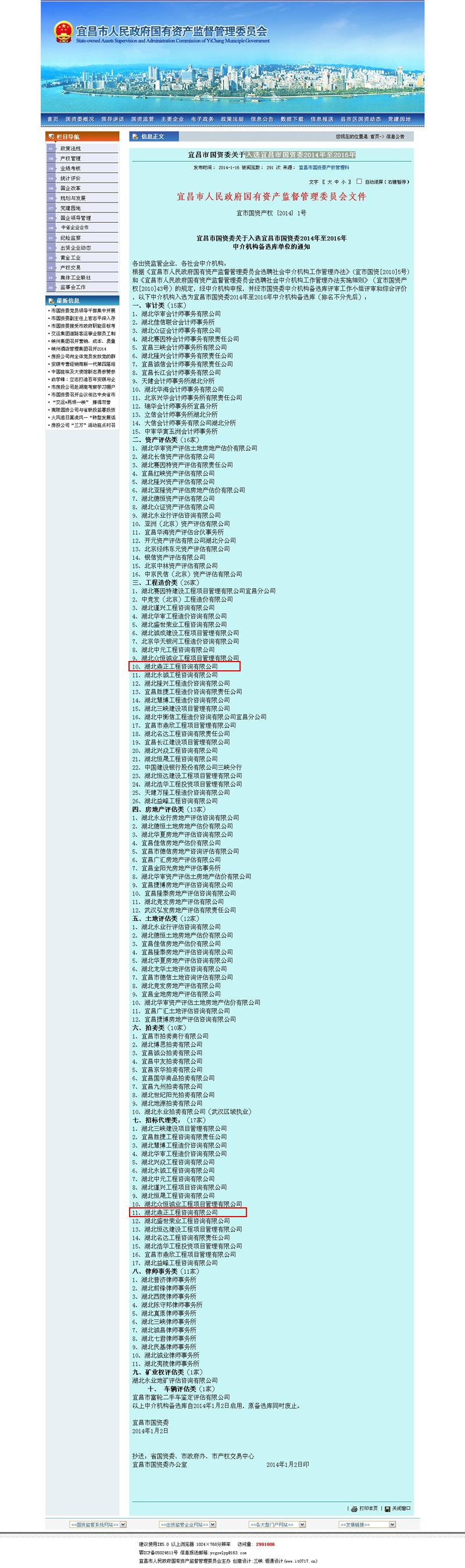 我公司入选宜昌市国资委2014年至2016年中介机构备选库