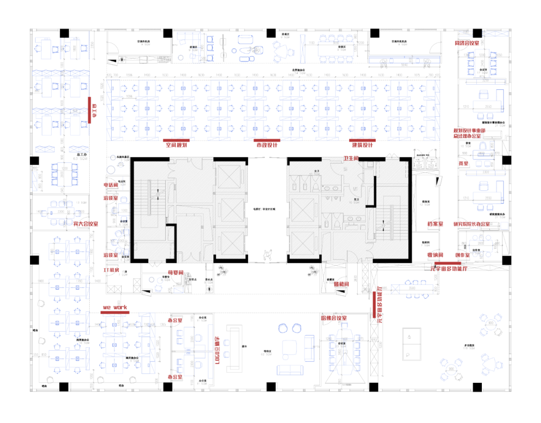 在空间规划上,我们根据工作方式的特点,充分考虑功能与不同情境的活动需求,打造鼓励与展示创意过程的空间氛围。在这里,设计师们可以头脑风暴、集思广益、舌战群儒;亦可以举办各种形式的研讨与社交活动;还可作为规划设计事业部对外展示与交流的窗口。