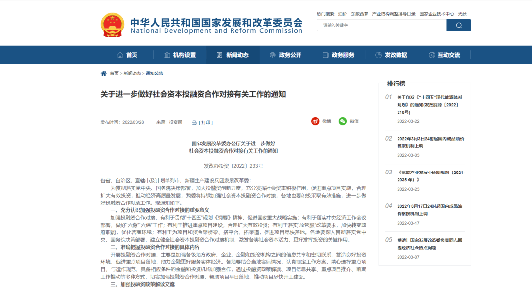 3月28日,国家发展改革委办公厅印发《关于进一步做好社会资本投融资合作对接有关工作的通知》(以下简称《通知》),部署各地积极采取有效措施,进一步做好投融资合作对接工作。