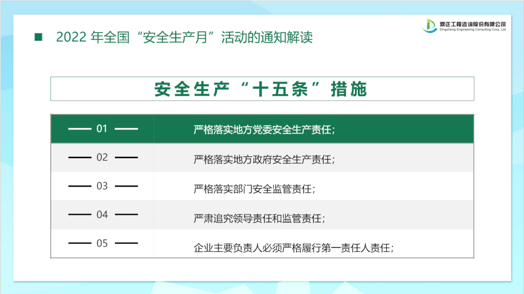 2022年全国“安全生产月”重点工作要求,1.深入学习贯彻习近平总书记关于安全生产重要论述,推动落实安全生产十五条措施;2.宣传贯彻安全生产法,推动“第一责任人”守法履责;3.持续开展“安全生产万里行”活动,分类强化警示教育;4.广泛开展“安全宣传咨询日”和安全宣传“五进”活动,提升社会公众安全意识和自救互救能力。