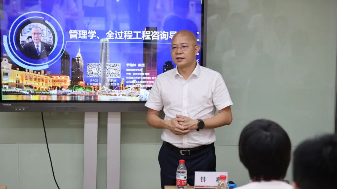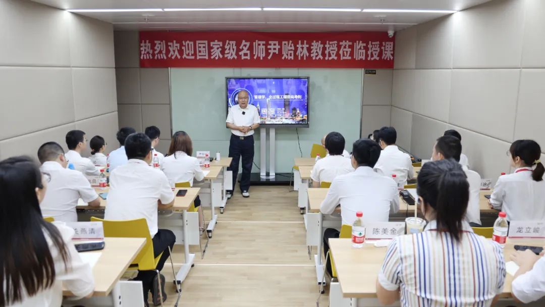钟泉董事长为尹教授到来授课表示热烈的欢迎与崇高的敬意。钟泉董事长从1997年开始就跟随尹教授学习,在作为造价工程师以至成为一家工程咨询企业领导者的职业道路上,一直都深受尹教授思想影响。他是尹教授多年来在全国各地讲课的忠实听众,深为尹教授的高深思想与授课魅力折服,他表示,能够邀请尹教授为工程咨询行业的“未来之星”授课,是一件代表着行业发展“薪火相传”的大事情。