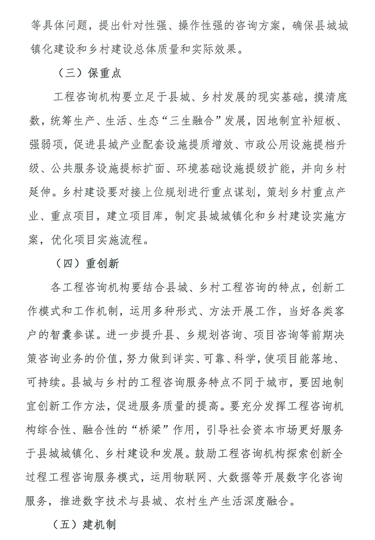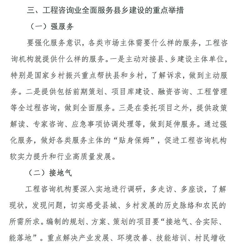 县城城镇化建设、乡村建设是一项宏大的社会工程,需要整体的、长远的规划。特别是城乡“二元”化结构较为明显,大部分乡镇和村庄发展规划欠缺,村落布局散乱,公共服务供给不足,严重制约了县城、乡村发展。规划咨询,注重规划先行,因地制宜,可运用工程技术、科学技术、经济管理和法律法规等多学科的知识与经验,为县城建设项目决策提供智力服务,解决县城发展与定位问题,避免错乱发展,无效竞争。