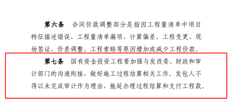 推行过程结算,建设单位应满足施工所需的资金安排,工程验收通过时原则上应同步完成工程款结算,不得变相拖延结算。国有资金投资工程应当按照国家有关规定确保资金按时支付到位,不得以未完成审计作为延期工程款结算的理由。在以往的建设工程司法案例中,合同双方若在合同中约定以行政审计后的价款作为结算价款的,法院予以支持。众所周知,行政审计一般在项目验收完成之后进行,那么在推行施工过程结算的背景下,发包人在招标文件及合同条款中再约定以行政审计后的价款作为结算依据的,明显与过程结算的推行意义相违背。