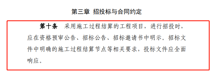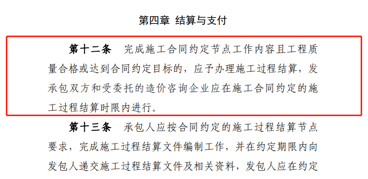 本条定义何为施工过程结算,相较住建部2021年发布的《建筑工程施工发包与承包计价管理办法》(修订征求意见稿)第十九条规定“全面推行施工过程结算和支付。发承包双方通过合同约定,按时间节点或进度节点对周期内已完成且无争议的工程量进行价款计算、确认,并按照合同约定比例支付。”《暂行办法》增加了节点验收,验收是节点结算与支付的前提。