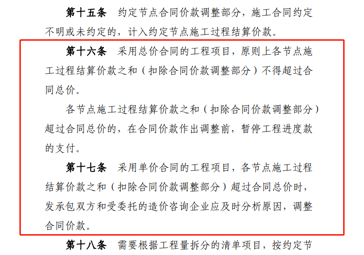 分别对总价合同的建设项目和单价合同的建设项目的施工过程结算的方式和过程进行解释、说明。总而言之,不管总价合同还是单价合同,施工过程结算价款之和(扣除合同价款调整部分)均不得超过合同总价,否则可能出现工程未完成已支付完成的情况。具体支付比例可根据发包人资金使用计划在合同中约定,但不得低于当地行政主管部门的相关规定。