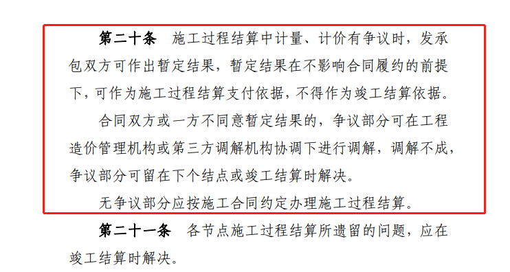 施工过程结算中计量、计价有争议和无争议两种情形。对于有争议部分,发承包双方可作出暂定结果,并作为施工过程结算支付依据,但不得作为竣工结算依据,最终竣工结算按照双方在调解后确定,或者在下个结点或者竣工结算时确定。