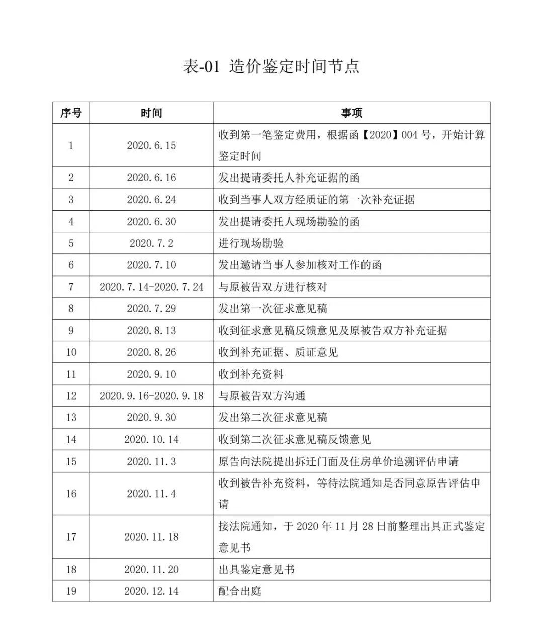 案例项目的造价鉴定中,时间节点详表-01。