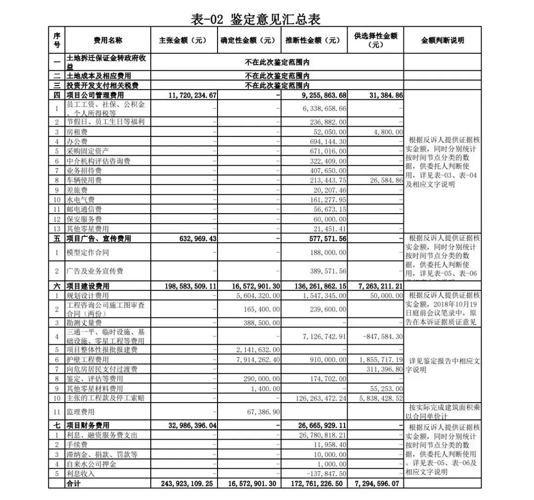 由于本项目涉及费用项目、金额均较大,《鉴定意见书》中分别根据证据情况、国家文件规定、解除合同时间等分类方式,逐项对金额进行了分类,并附加相关说明,为法庭判决提供了数据支撑。最终鉴定确定性金额16,572,901.30元,推断性金额172,761,226.50 元,供选择性金额7,294,596.07 元,具体详表-02