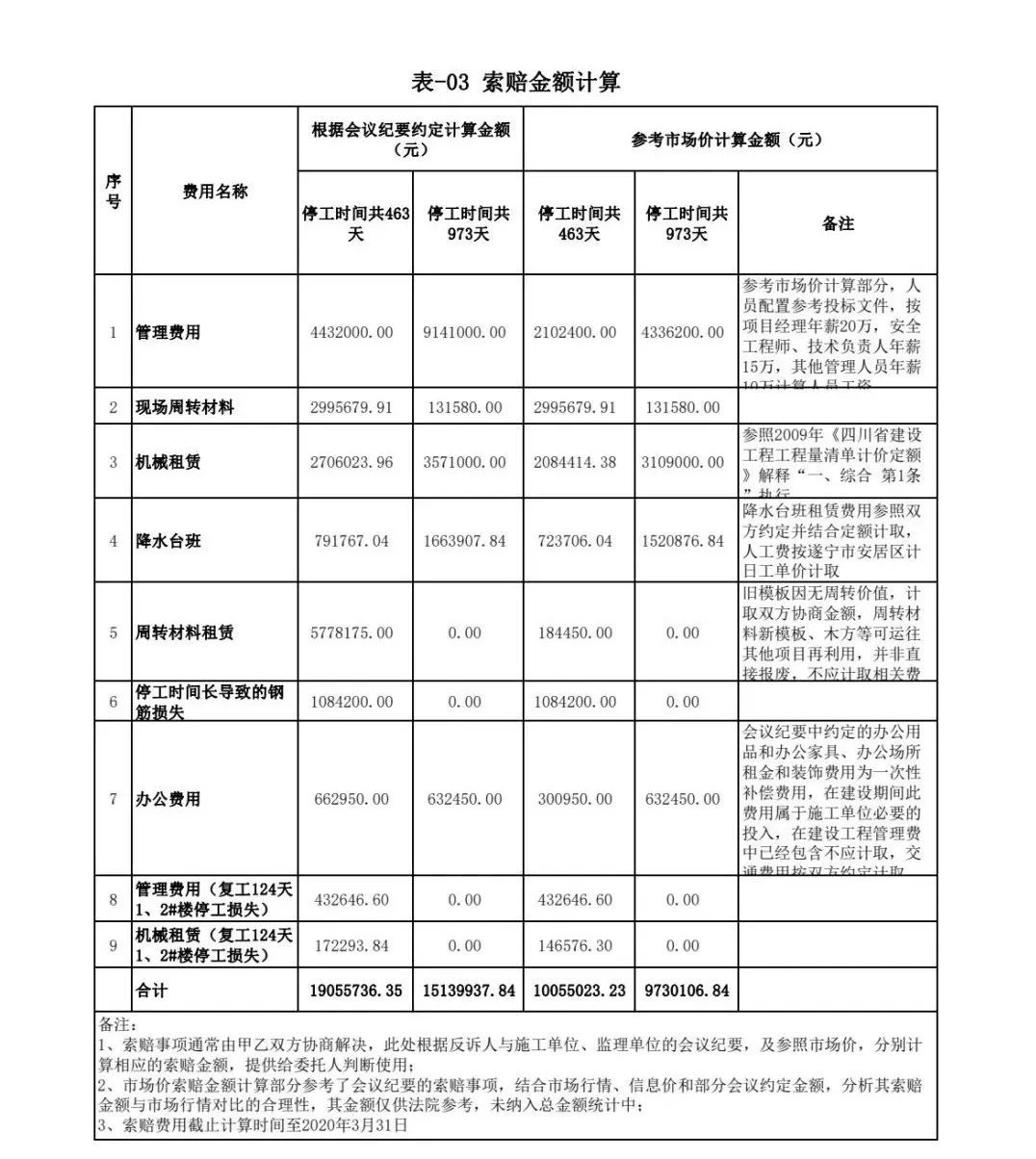 政府与开发公司之间的合同已解除,但鉴定时,开发公司与施工单位之间签订的施工合同并未解除。项目公司管理费的时间节点判定就成了一个难题。鉴定人经多次内部讨论,最终确定:将项目公司管理费列为推断性金额,且根据不同方案分别统计金额,提交法院参考(具体数据详表-03):