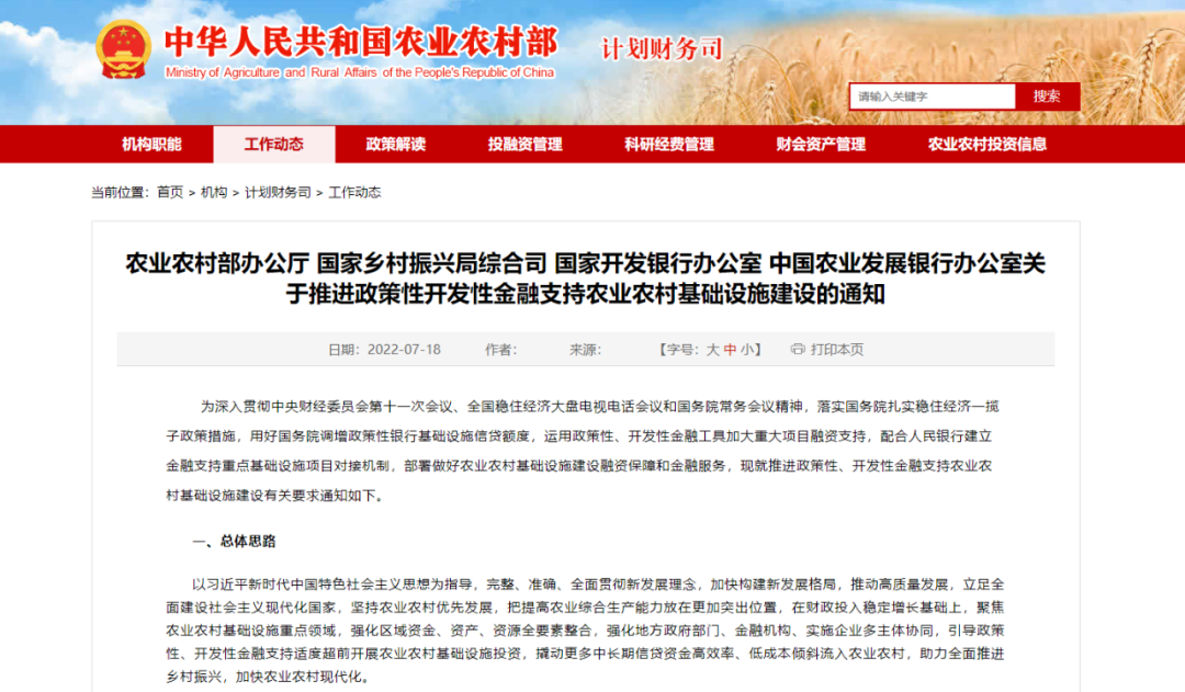 为深入贯彻中央财经委员会第十一次会议、全国稳住经济大盘电视电话会议和国务院常务会议精神,落实国务院扎实稳住经济一揽子政策措施,用好国务院调增政策性银行基础设施信贷额度,运用政策性、开发性金融工具加大重大项目融资支持,配合人民银行建立金融支持重点基础设施项目对接机制,部署做好农业农村基础设施建设融资保障和金融服务,现就推进政策性、开发性金融支持农业农村基础设施建设有关要求通知如下。