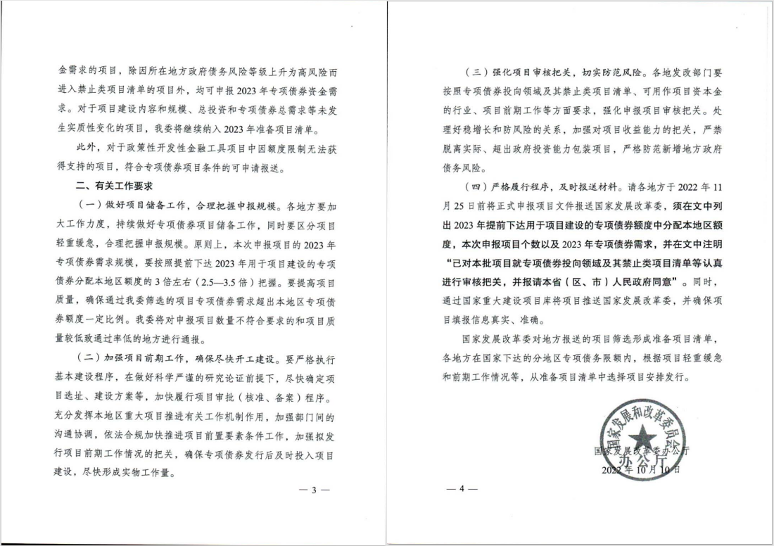 2020年、2021年的专项债申报通知都是财政部与发改委联合发文,今年(2022年)是发改委发文,发改委对产业,对规划,对项目的敏感度更高,论证也更充分,所以,2023年的专项债项目方案与可研的编制质量要求将会有所提升,在项目入库的源头审核方面或将更为严格。