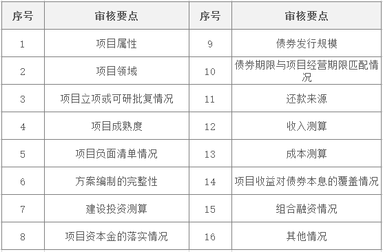 各省财政厅对发行文件进行审核,着重对《可研报告》与《实施方案》进行审核,审核要点如下:各省财政厅对项目的审批程序进行审核,项目达到开工条件后正式发行,审批程序审核事项清单如下: