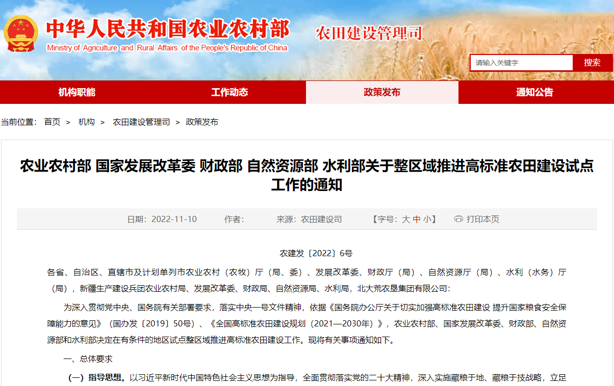 为深入贯彻党中央、国务院有关部署要求,落实中央一号文件精神,依据《国务院办公厅关于切实加强高标准农田建设 提升国家粮食安全保障能力的意见》(国办发〔2019〕50号)、《全国高标准农田建设规划(2021—2030年)》,农业农村部、国家发展改革委、财政部、自然资源部和水利部决定在有条件的地区试点整区域推进高标准农田建设工作。现将有关事项通知如下。