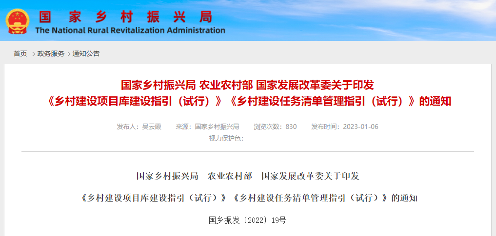 根据《中共中央办公厅、国务院办公厅关于印发〈乡村建设行动实施方案〉的通知》有关要求,国家乡村振兴局、农业农村部、国家发展改革委研究制定了《乡村建设项目库建设指引(试行)》《乡村建设任务清单管理指引(试行)》,现印发你们,请结合实际抓好贯彻落实。