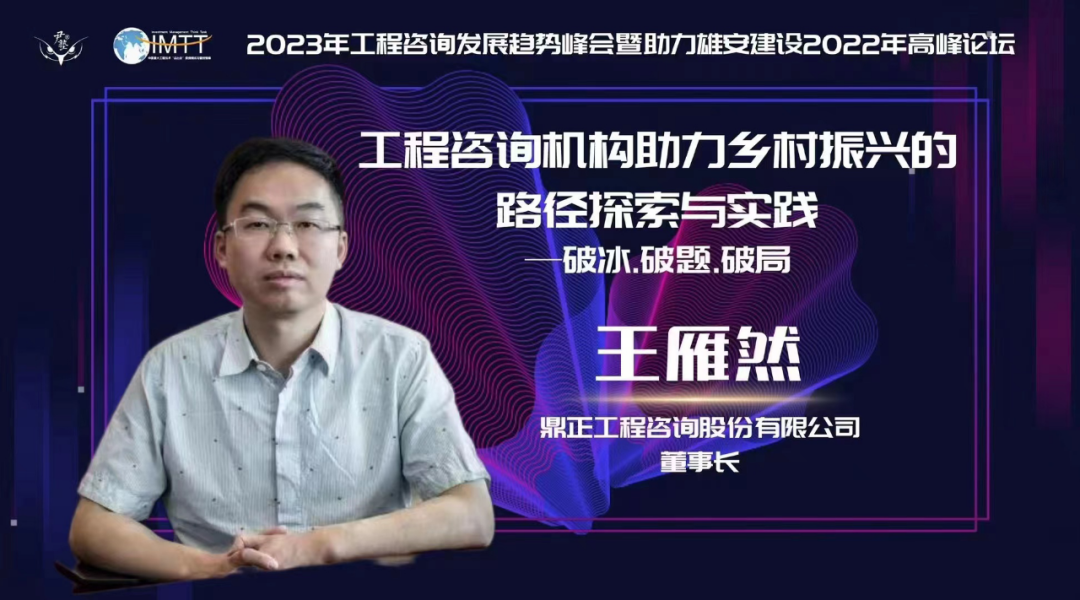王雁然董事长受邀参与论坛并发表主题演讲,他以《工程咨询机构助力乡村振兴的路径探索与实践》为题,从破冰、破局、破题三个层次逐步切入,先后论述了新时代背景下推进乡村振兴战略面临的机遇与挑战。