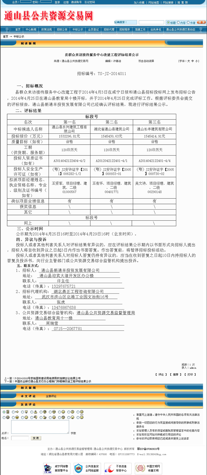 县群众来访接待服务中心改建工程评标结果公示