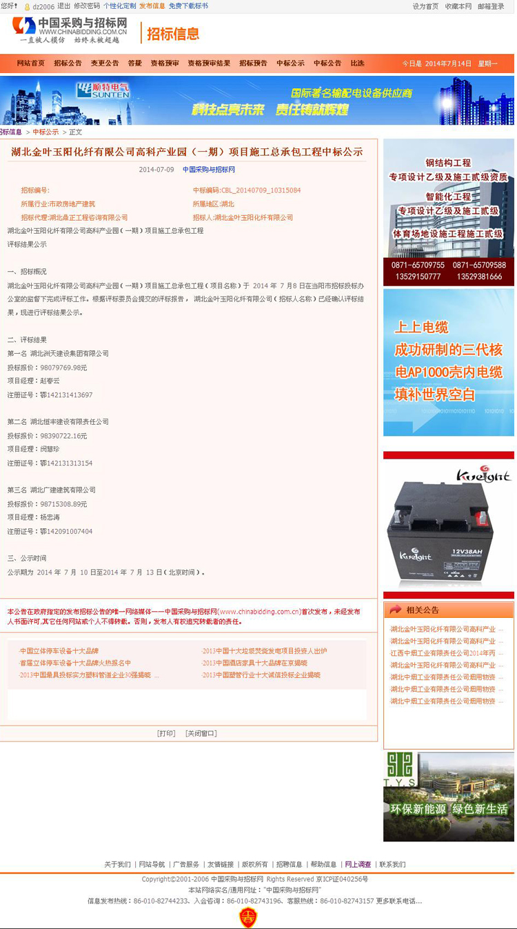 湖北金叶玉阳化纤有限公司高科产业园(一期)项目施工总承包工程