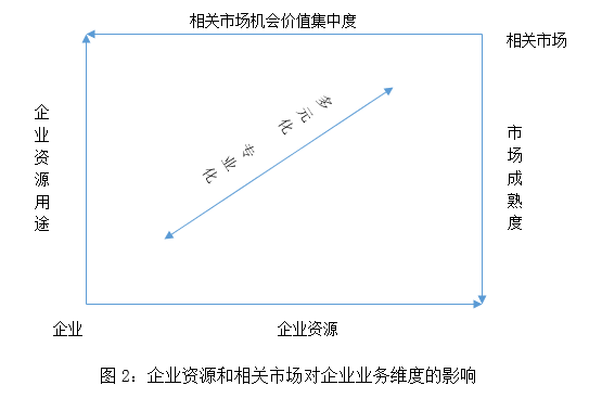 当前我国城建领域市场成熟度较低,市场价值集中度不高,比较适合进行多元化经营。另外,企业的资源能力也决定了企业从事某项业务所可能实现的价值,企业在某项业务上的资源能力越强,说明企业在这项业务上的相对能力就较强。城投公司的多元化维度和规模主要由这两种因素决定,如图2所示: