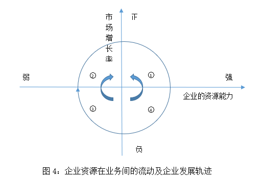 业务开始都是企业资源能力较弱,市场增长率很强,企业会注入资源;然后业务的企业能力变强,市场增长率会很高,企业继续投入资源。但过了高增长期之后,该业务的增长率会降低,降低的原因是由于市场竞争者增多导致的。如果企业处于比较劣势的地位,那么业务就会处于负增长,企业就应从中抽取资源投入有潜力或增长趋势正强劲的业务。该业务的企业能力随着资源的逐渐减少,业务能力弱化,企业进入第三象限,直至该业务消亡。