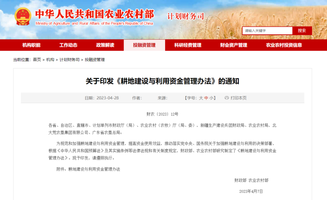 财政部、农业农村部印发《耕地建设与利用资金管理办法》