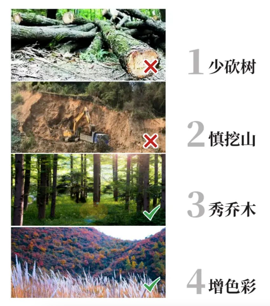 1.林地保护:少砍树、慎挖树、秀乔木、增色彩