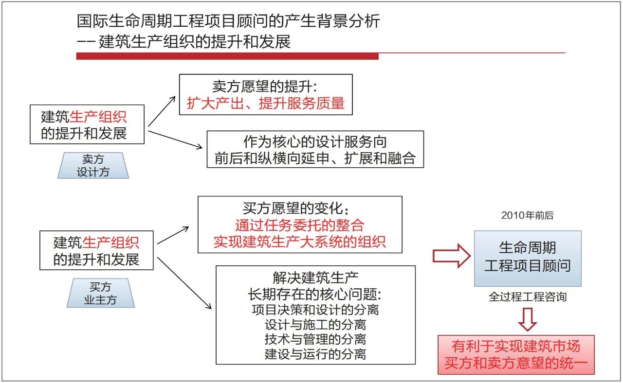 接下来,我们将从建筑生产组织的提升和发展来讨论生命周期工程项目顾问是怎么产生的?也就是我们现在讲的全过程工程咨询是怎么产生的?它的初心是什么?我认为,它产生的背景主要是两个:一个是卖方——设计方,另一个是买方——业主方。