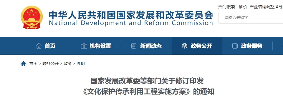 日前,国家发展改革委会同住房城乡建设部、中央宣传部、文化和旅游部等部门对《文化保护传承利用工程实施方案》进行了修订。