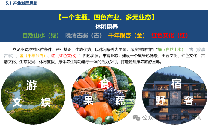其中,双河村通过发挥特色农业产业优势建设农业品牌,延伸农业加工产业链开启创收新征程,积极发展乡村休闲业打造诗意田园水乡,主要打造田园综合体、滨河休闲体验,拓展农业休闲旅游业态。泉水寺村重点结合国家级专用汽车和应急装备检测研发基地的建设基础,构建以产业基地配套服务为主导,以生态种养、休闲农业为特色的产业体系。小岭冲村重点整合“绿(自然山水)、古(晚清古寨)、金(千年银杏)、红(红色文化)”四色资源,构建“绿+古+金+红”四色产业,打造品质活力乡村旅游。九口堰村重点以丰富的红色文化、自然资源为基础,以红色文化体验为主导产业,以文化带动旅游,拓展红色体验、康养度假等产业,打造全国红色教育示范基地。