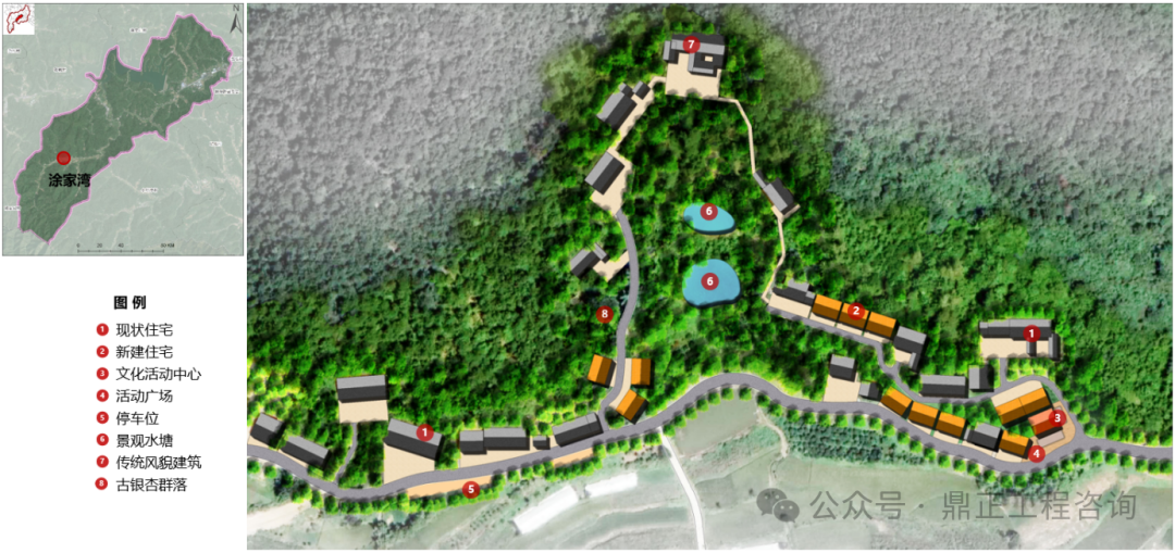 九口堰村为满足村庄集并及远期人口增长需求,规划于涂家湾设置一处居民安置点。场地现状民居较多,地形高差大,通过梳理现状闲置宅基地、拆除破旧房屋等措施整理出可以进行布局居民点的建设用地,点状布局居民点,居民点每户占地140平方米,共安置12户。
