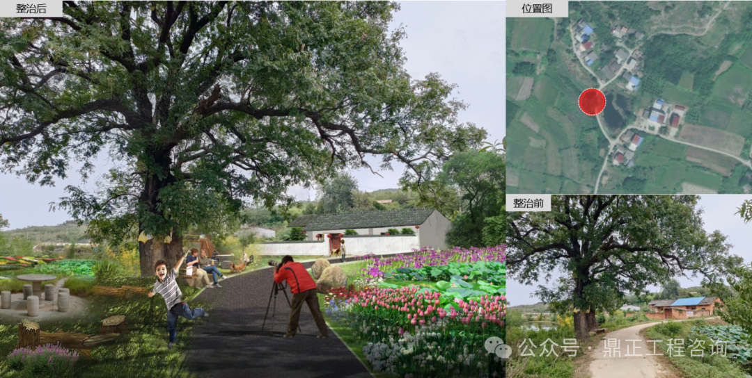 九口堰村入口空间,通过清理道路脏乱杂物,保留并完善修复破损路面;清理道路两侧杂草,梳理林下空间,沿线可播撒草籽,营造整齐干净的乡野景观;结合九口堰村特色的古银杏资源、香菇产业以及地方特色,于村口增设景墙,形成村庄入口标志;路边环境梳理,通过木桩作为空间分界物,植栽时令花卉,作为背景点缀。