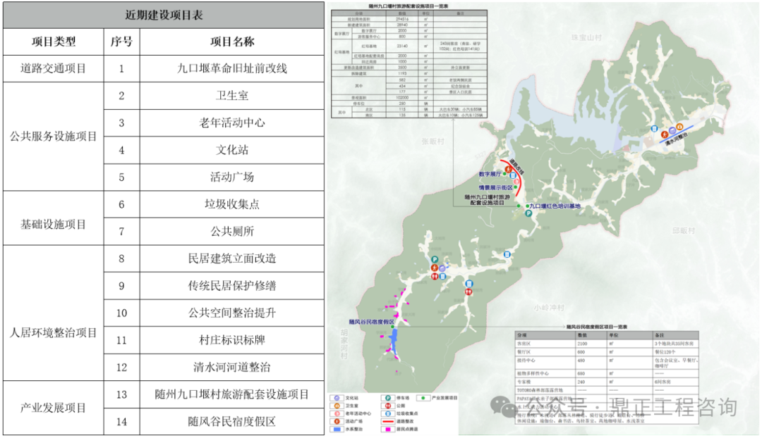 如九口堰村近期主要建设内容为基础设施与公共服务设施完善、人居环境整治,以及部分池塘整治和产业发展项目。