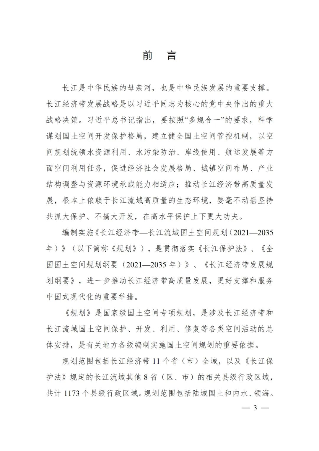 2024年2月9日,《长江经济带—长江流域国土空间规划(2021—2035年)》经国务院批复同意。9月10日,自然资源部正式印发《长江经济带—长江流域国土空间规划(2021—2035年)》。规划范围包括长江经济带11个省(市)全域,以及《长江保护法》规定的长江流域其他8省(区、市)的相关县级行政区域,共计1173个县级行政区域。规划范围包括陆域国土和内水、领海。其中,陆域面积240万平方公里。(后附规划范围详细表格)规划期限为2021年至2035年。