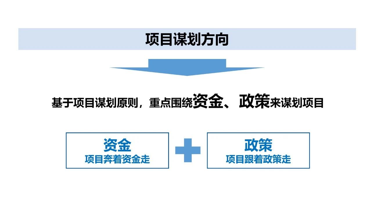 项目跟着资金走:当前,我国共有三大资金支持项目建设,分别是中央预算内资金、国债资金、地方政府专项债资金,故从项目落地资金保障的角度来看,谋划项目符合三大资金投向,更容易落地实施。