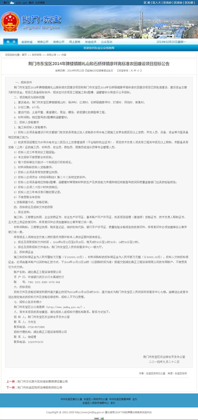荆门市东宝区2014年牌楼镇跪礼山和石桥驿镇廖坪高标准农田建设项目