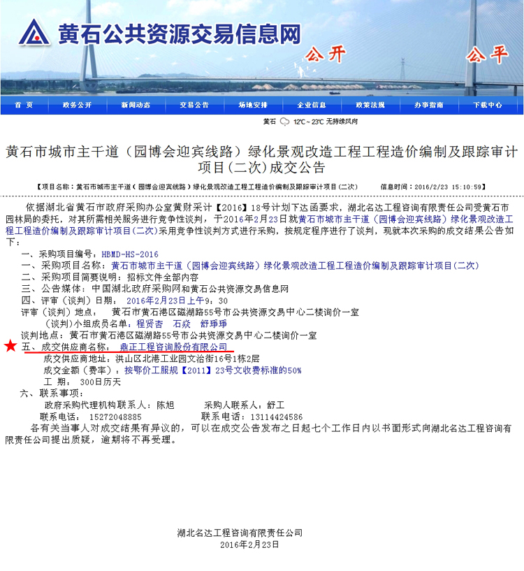 【经营成果】我司中标黄石市城市主干道(园博会迎宾线路)绿化景观改造工程工程造价编制及跟踪审计项目(二次)