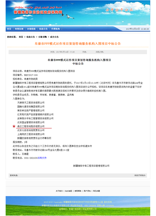 近日,新疆维吾尔自治区采购网公布了阜康市PPP模式运作项目策划咨询服务机构入围项目中标公告,我司成功入围。