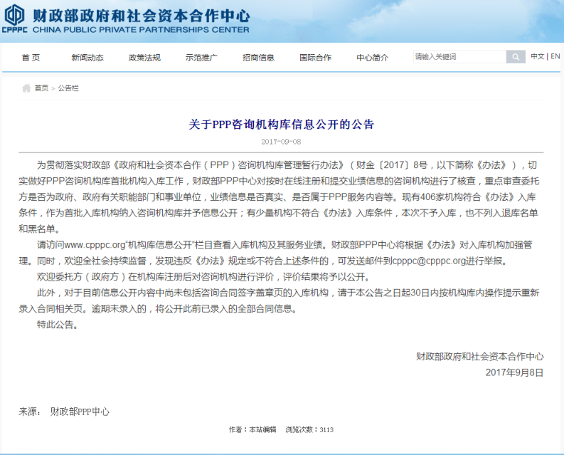 2017年9月8日,财政部PPP中心发布了《关于PPP咨询机构库信息公开的公告》,406家机构符合《政府和社会资本合作(PPP)咨询机构库管理暂行办法》(财金【2017】8号)入库条件,明胜m88官网公司成功入选财政部首批PPP咨询机构库。