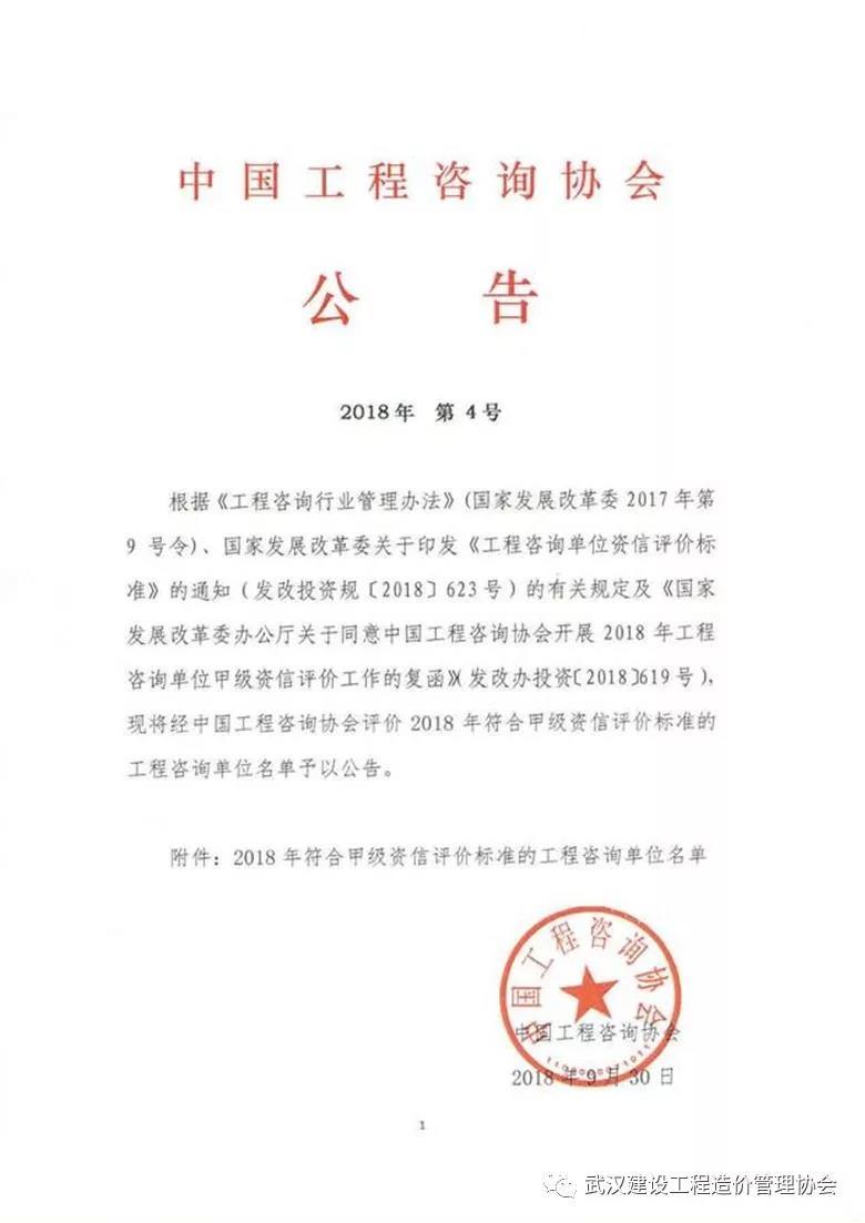 2018年9月30日,中国工程咨询协会发布了”2018年符合甲级资信评价标准的工程咨询单位名单”,明胜m88官网工程咨询获评工程咨询建筑、市政公用工程专业两项甲级资信,一项PPP咨询专项甲级资信。